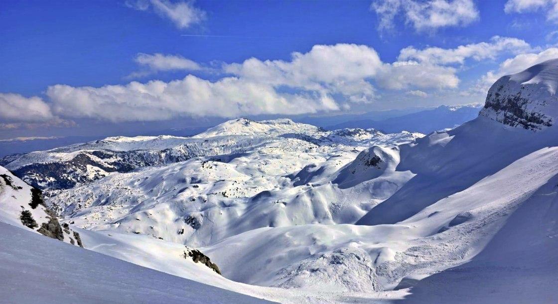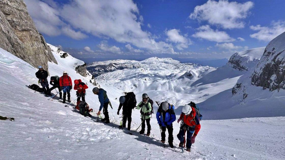 A to je bio vrh Pločno koji nas je i dalje čekao okovan snijegom i okružen ogromnim snježnim strehama. Dok je snijeg još škripio pod derezama kao nokti po zelenoj školskoj ploči krenuli smo prema vrhu noseći samo neophodnu tehničku opremu kako nam onako izmorenima od jučerašnjih napora nepotrebne stvari ne bi dodatno otežavale uspon. Vukući se, pardon, sigurnim korakom napredujući po nestvarno lijepim, snježnim krajolicima uvježbavali smo tehnike hodanja s derezama kombinirajući ih s upotrebom cepina, kad je to bilo potrebno. A bome je bilo potrebno!
